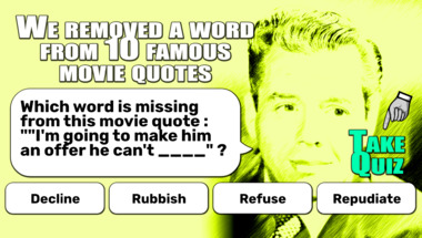 7/10 is the score to beat in this trivia quiz to put yourself over the average quiz taker. But you're probably going to be able to answer questions "Which word is missing from this movie quote : ""I'm going to make him an offer he can.." and "Which word is missing from this movie quote : ""Toto, I've got a feeling we're not in.." easy!