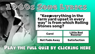 4/10 is the score to beat in this trivia quiz to put yourself over the average quiz taker. But you're probably going to be able to answer questions "What were the horses made from in "Two Little Boys"?" and ""Keep everything in the farm yard upset in every way" is from which Rolling Stones so.." easy!