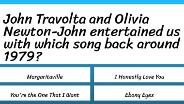 Look forward to questions like "Olivia Newton-John entertained us with which song back around 1979?" and "John Travolta and Olivia Newton-John entertained us with which song back around 1979?"