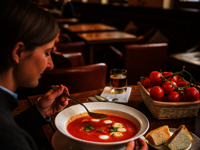 Imagine you're sitting down with a toasty grilled cheese sandwich, and you decide to add a touch of international flair to your meal. You opt for a bowl of German tomatensuppe. What delightful dish have you just paired with your cheesy creation?