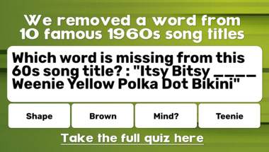 In this fun 60s songs with missing words quiz we're going to ask questions like "Which word is missing from this 60s song title? : "Itsy Bitsy ____ Weenie Yellow Polk.." and "Which word is missing from this 60s song title? : "You've Lost That Lovin' ____"".