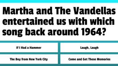 4/10 is what people on average are scoring in this 1960s Songs quiz so far. Are you ready to answer questions like "Nancy Sinatra entertained us with which song back around 1967?" and "Mary Wells entertained us with which song back around 1965?"