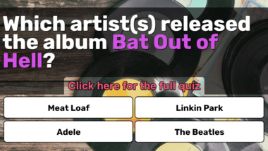 5/10 is what people on average are scoring in this trivia quiz so far. Are you ready to answer questions like "Which artist(s) released the album "Bat Out of Hell"?" and "Which artist(s) released the album "Bad"?"