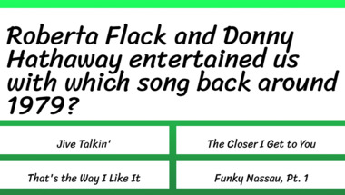 3/10 is what people on average are scoring in this trivia quiz so far. Are you ready to answer questions like "Donna Summer entertained us with which song back around 1977?" and "Roberta Flack and Donny Hathaway entertained us with which song back around 1979?"