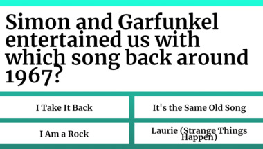 4/10 is the score to beat in this 1960s Songs quiz to put yourself over the average quiz taker. But you're probably going to be able to answer questions "Bob Dylan entertained us with which song back around 1966?" and "Simon and Garfunkel entertained us with which song back around 1967?" easy!
