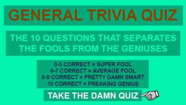 If you can answer "Richard M. Nixon is known best as this?" and maybe even "Which citrus fruit looks like a big orange?" there is a good chance that you're going to beat the average score of 6/10 in this General Trivia quiz